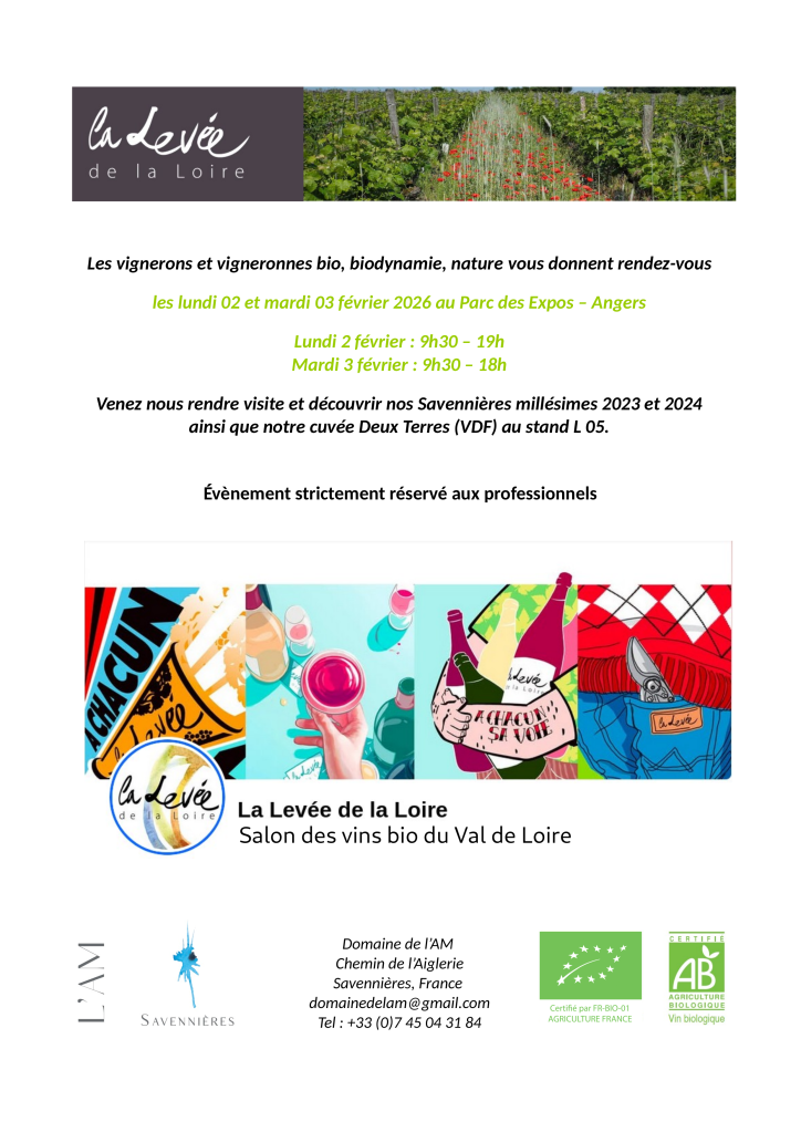 Nous aurons le plaisir de vous faire découvrir nos Savennières cuvées A et M 2024 ainsi qu’un petit nouveau cette année, la cuvée Deux Terres (Vin de France), 100% chenin.